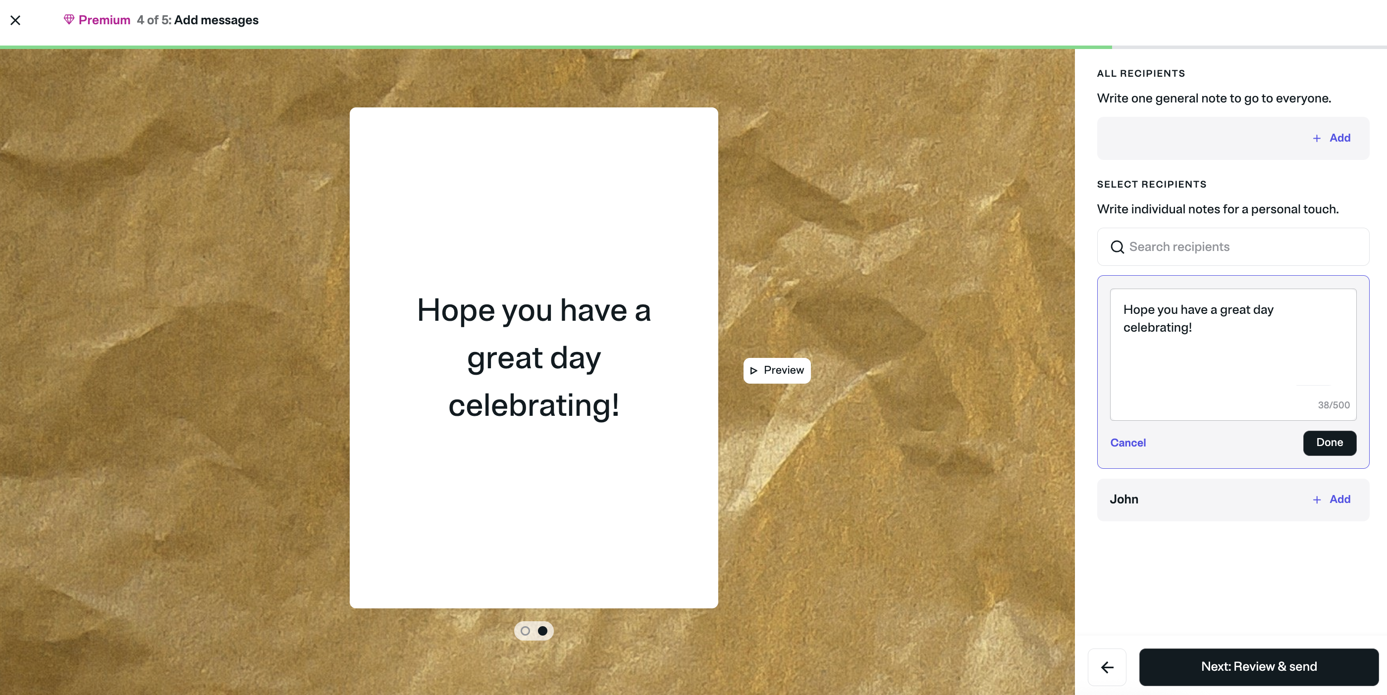 11\. In Step 4, you can add a note to the recipient. If you are sending an eGift card to multiple recipients, you will be able to add a custom note for each recipient.